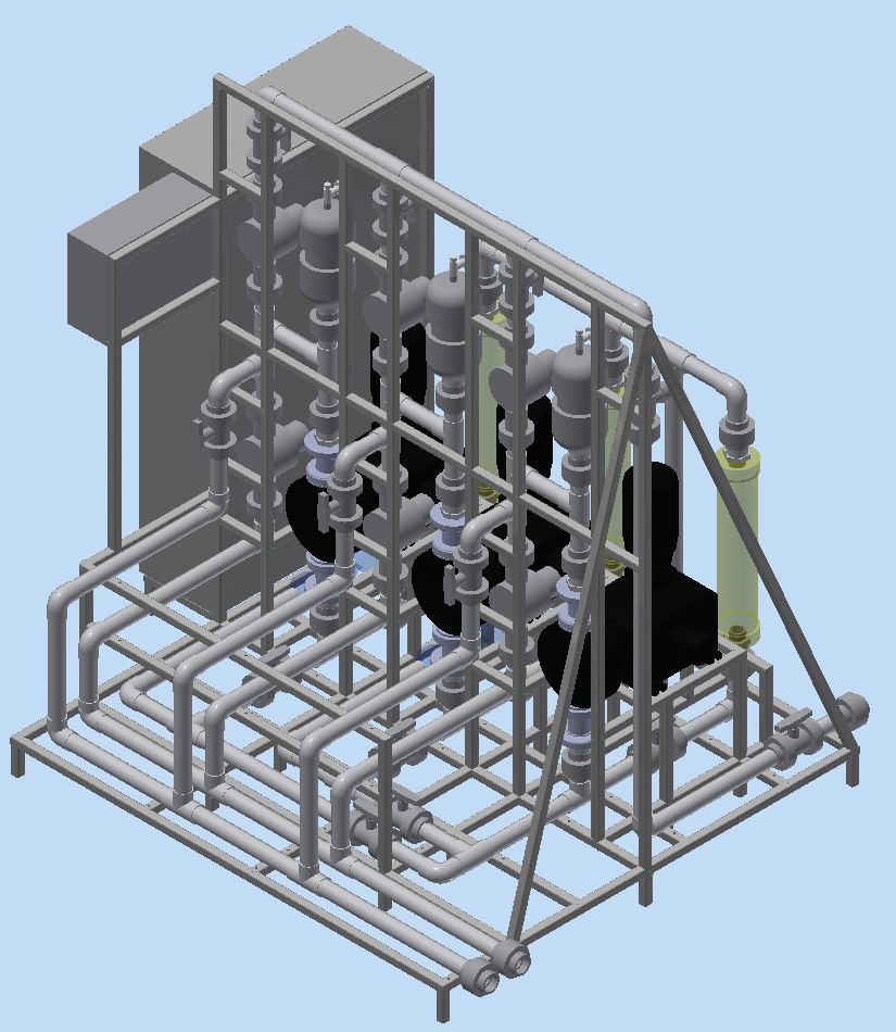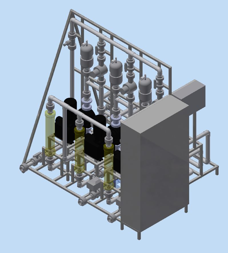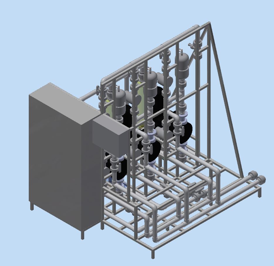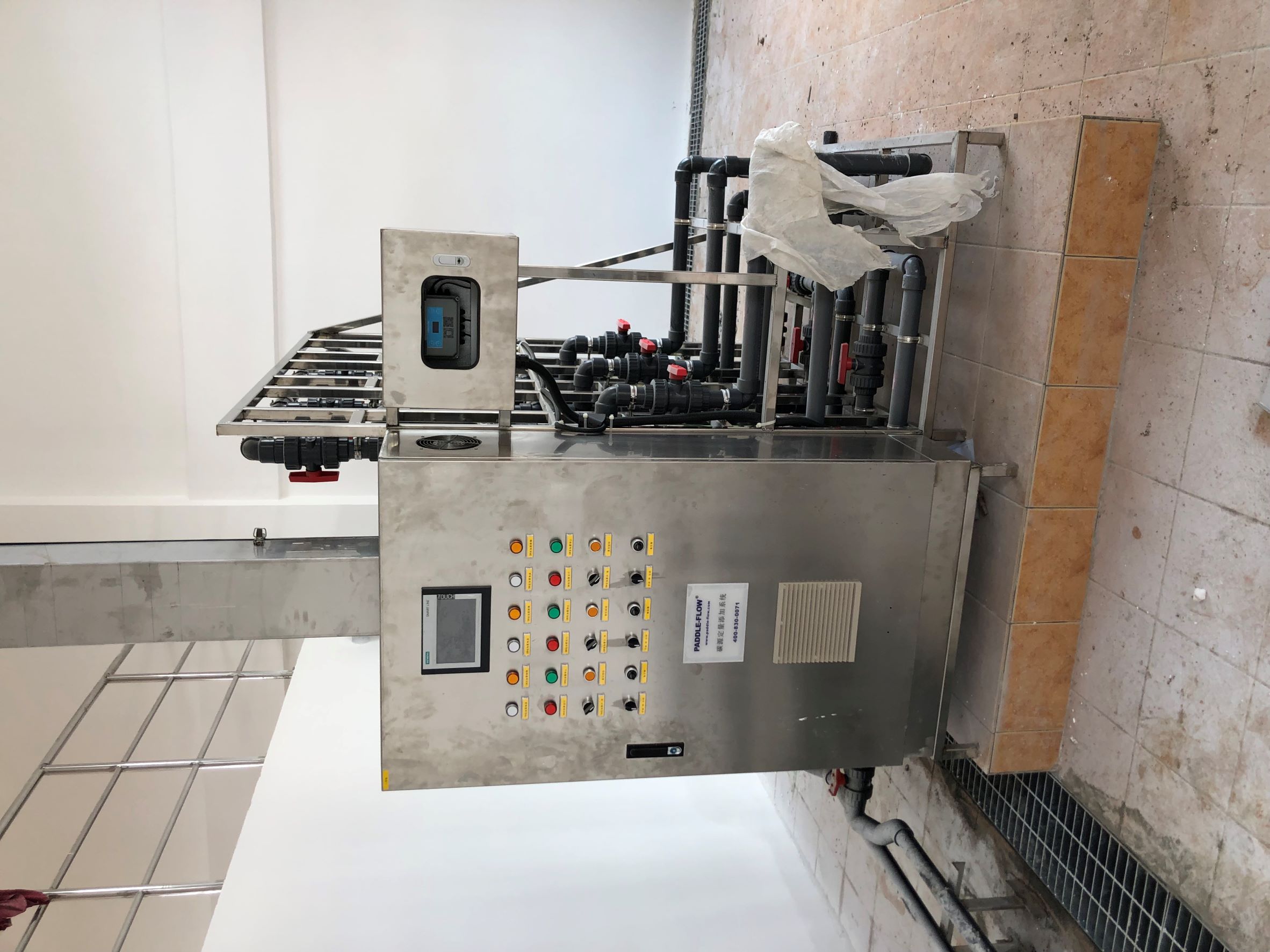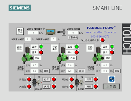 全自动加药装置,使用Pulsafeeder机械隔膜计量泵,DM7系列; 西门子S7-1200PLC,西门子Smart-line触摸屏,ABB变频器,变频调速控制流量; 系统全自动运行,带流量反馈