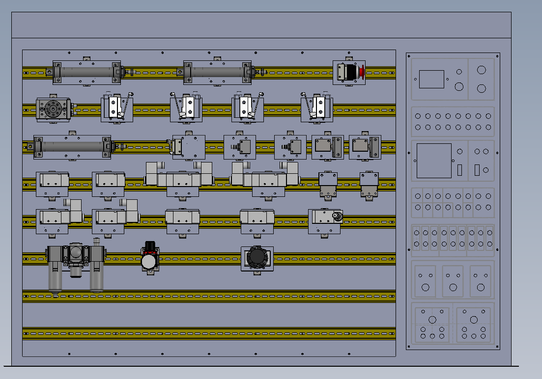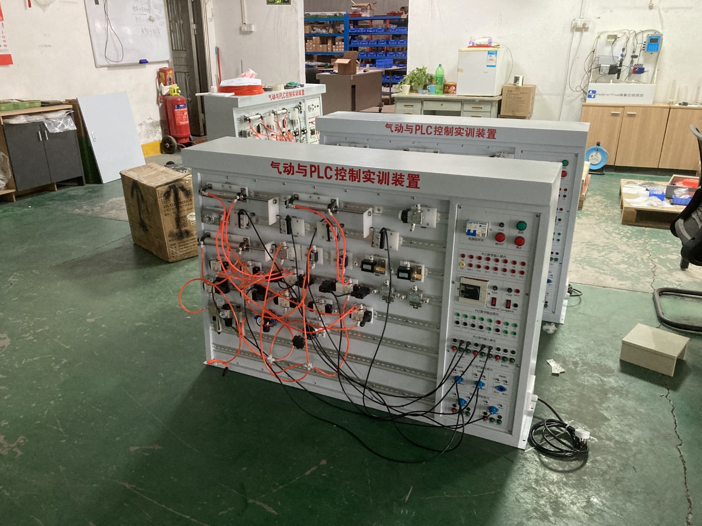 技工学校学生实训平台,中专技校学生在实训平台上,练习操作PLC控制各种气动元件。